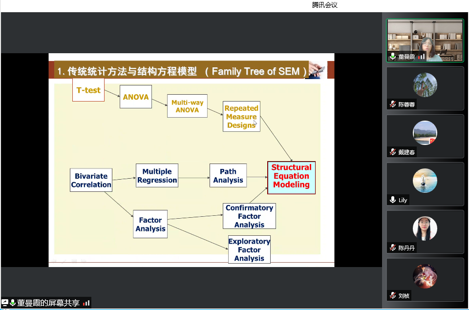 董曼霞教授主持多项国家社科及教育部重大攻关课题,在国际权威及国内各核心期刊发表大量研究论文,在科研领域成果颇丰。因此在第二场讲座中董教授为大家做了“结构方程建模及其在应用语言学研究中的运用”的主题讲座。董教授认为在研究中,研究方法和工具非常重要,而结构方程模型就是实证研究的有效工具之一,并从最基本的概念到简单模型,再到复杂模型,一步步教授大家如何构建结构方程模型。