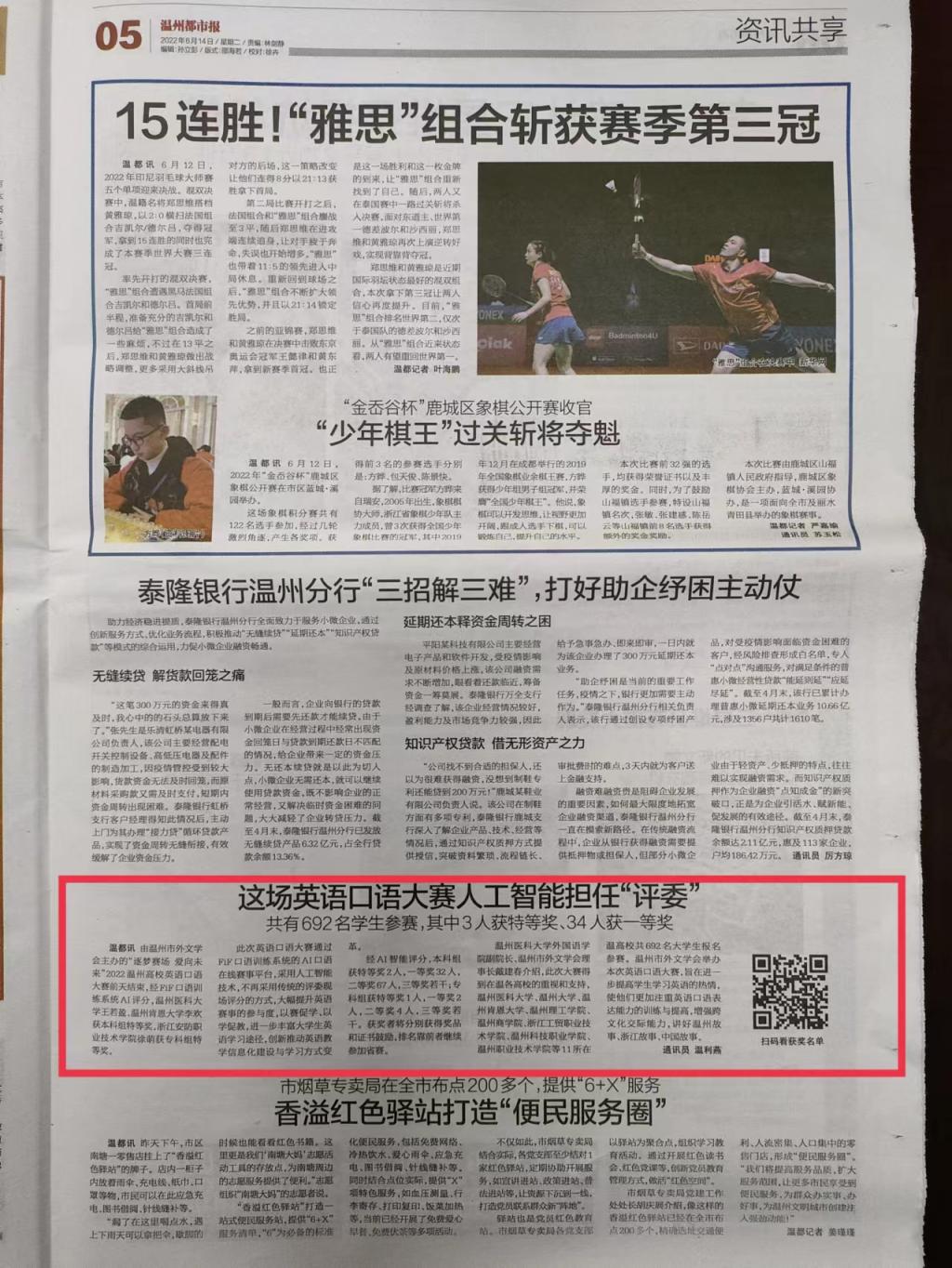 温都讯 由温州市外文学会主办的“逐梦赛场 爱向未来”2022温州高校英语口语大赛前天结束,经FiF口语训练系统AI评分,禁漫天堂
