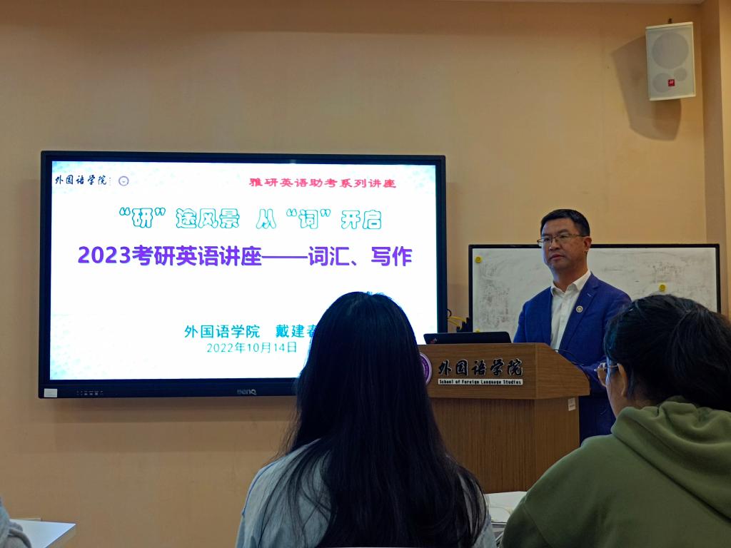 副院长戴建春主讲,以《“研”途风景,从“词”开启》为题,内容包含“考研英语综合介绍”和“写作&词汇”两大模块。