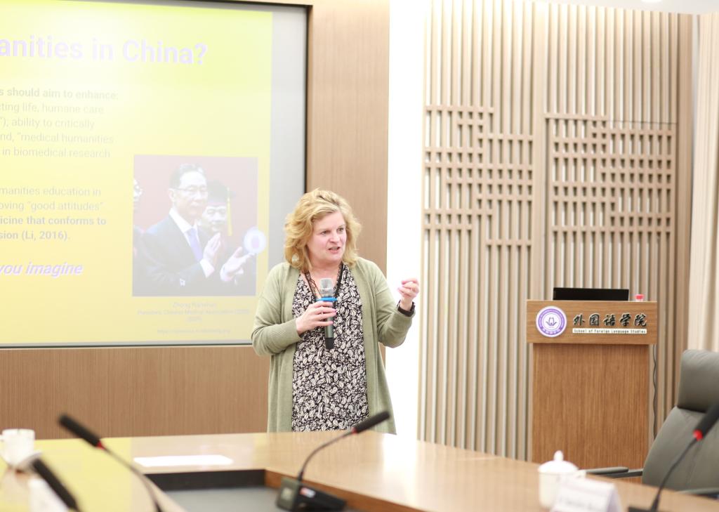 Pamela Brett-Maclean以医学人文的基本概念、发展历程和重要意义作为切入点进行详细讲解,分享了当前国际医学人文的发展以及医学人文研究的热点和前沿问题。她向大家介绍了阿尔伯塔大学的医学教学项目和健康医学人文艺术项目(AHHM),并结合《世界医学科技史》、《医患沟通学》等课程内容全方位阐释医学人文的积极意义。在最后的提问互动环节,学院老师纷纷参与互动,针对国际医学人文前沿发展和加拿大论文期刊介绍等问题与Pamela Brett-Maclean教授展开了讨论与交流,深化了彼此基于不同文化背景下对医学人文的理解。