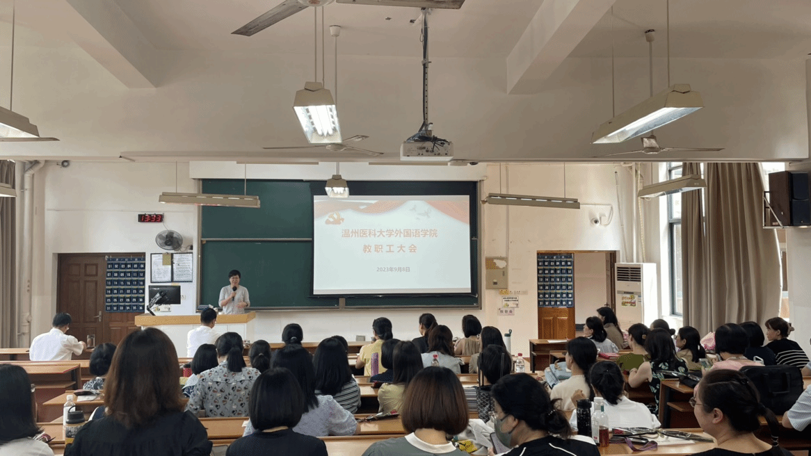 学院教师代表李莹莹、张冰茹和陈亦挺作交流发言。李莹莹分享了暑期参加“2023年暑期全国高校外语教学研究与教师发展系列研修班”的收获,重点汇报了外语教学研究方法。张冰茹分享了参加“全国医学英语课程群虚拟教研室成立大会暨全国医学英语课程建设及学科发展研讨会”的心得体会,传递了前沿的学术理念。陈亦挺介绍了暑期参加的四次会议,她总结了各位专家的发言内容,生动形象地描述了人工智能等前沿技术在课堂的应用场景。