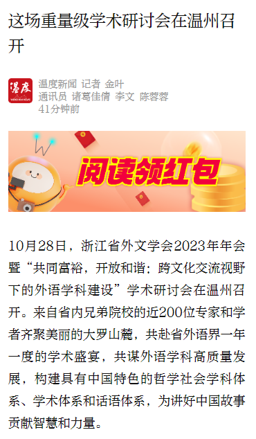 10月28日,浙江省外文学会2023年年会暨“共同富裕,开放和谐:跨文化交流视野下的外语学科建设”学术研讨会在温州召开。来自省内兄弟院校的近200位专家和学者齐聚美丽的大罗山麓,共赴省外语界一年一度的学术盛宴,共谋外语学科高质量发展,构建具有中国特色的哲学社会学科体系、学术体系和话语体系,为讲好中国故事贡献智慧和力量。