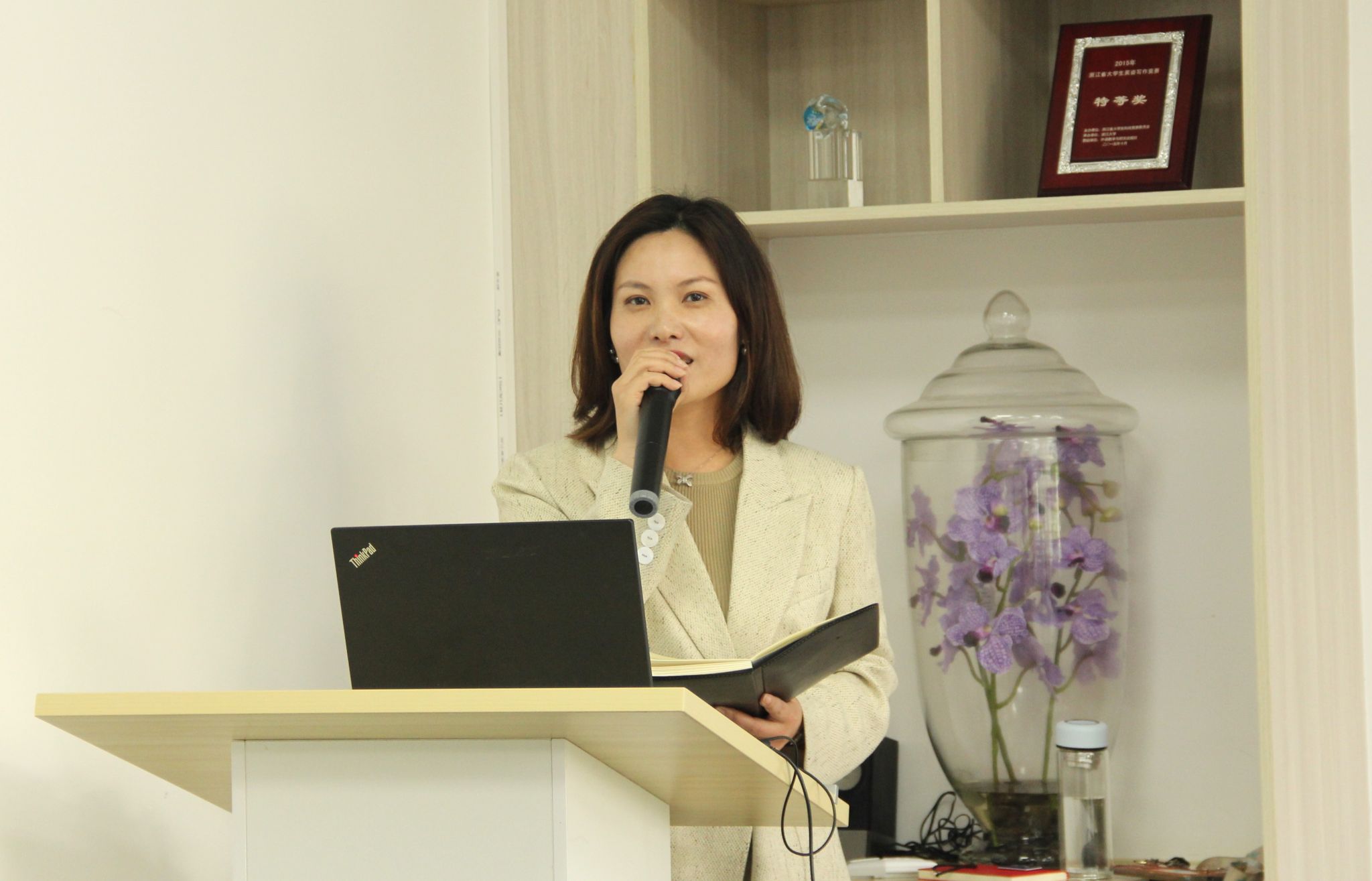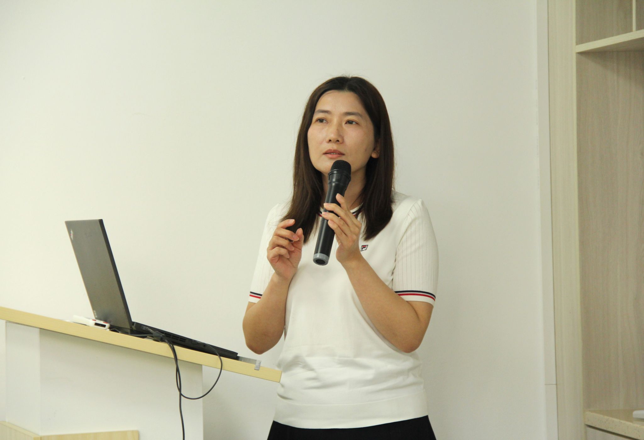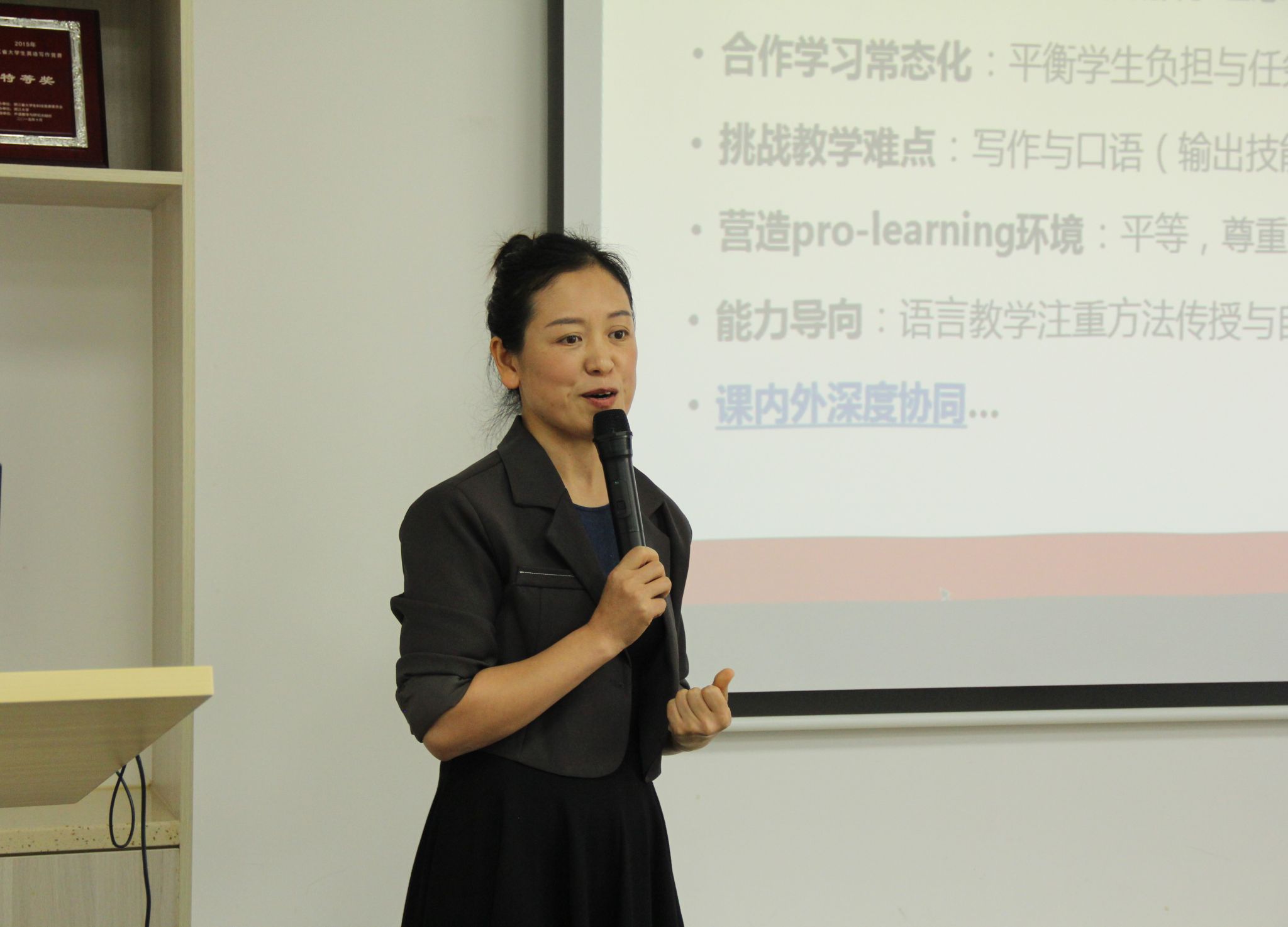 陈亦挺副教授以“教书育人,以爱为马活成一道光”分享教学经验,并详细介绍了自己的教学理念和教学理论。她指出,在教学实践中,要建立与学生的情感连接,营造积极的课堂氛围;要推动合作学习常态化,平衡学生的负担与任务难度;要以能力为导向,注重方法传授与学生自主学习能力培养。陈亦挺还分享了她所任教的《人文思辨与英语写作》《英语公共演说与思辨能力训练》等课程的教学目标,并以自己用人工智能制作的英文歌为例,鼓励大家要主动学习新技术,利用人工智能等技术实现教育教学场景创新。