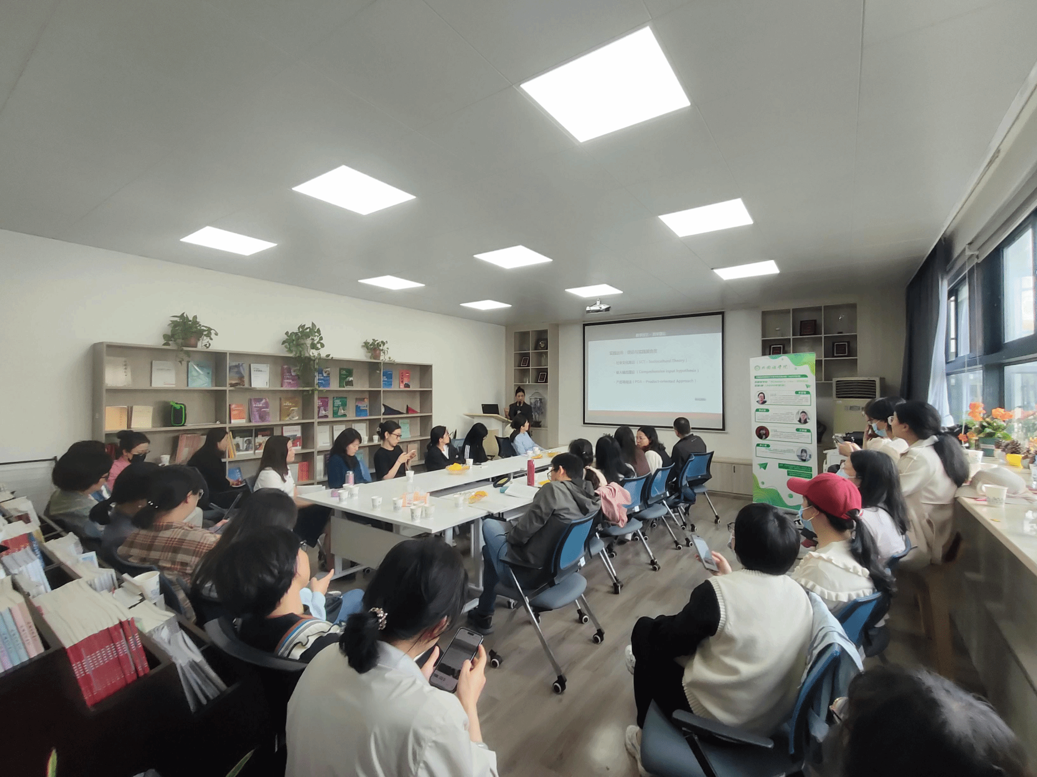 活动伊始,李莹莹教授以“赋能未来:大学英语教育改革与发展探索”为题分享参加“第八届全国高等学校外语教育改革与发展高端论坛”的心得体会,传递前沿的学术理念。她指出,这场论坛是把握高等教育时代脉搏、洞见外语教育改革方向的教育盛会,聚焦高校外语教育教学发展核心话题,共探了人工智能时代外语教育发展新方向。她强调,信息技术的发展为外语教育带来了机遇和挑战,但教育是人和人之间灵魂的互动交流,部分教育元素不能被数字化,外语教师与其被动应变,不如主动求变,外语教育大有可为。