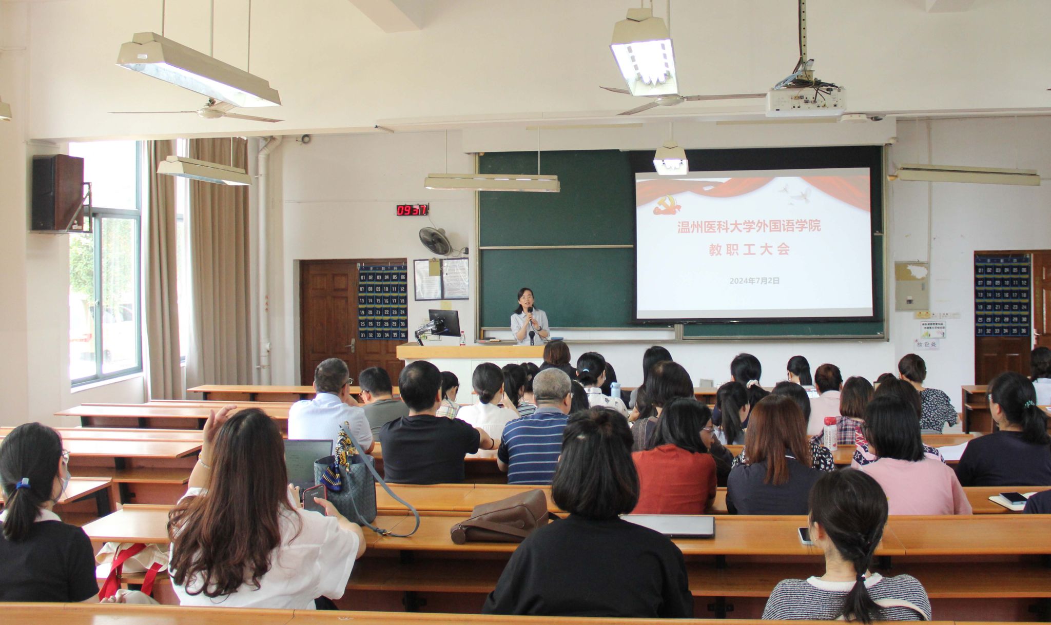 在7BJ104召开期末教工大会暨师德师风警示教育会。学院领导班子、全体教职工参会,会议由党委书记刘洁主持。
