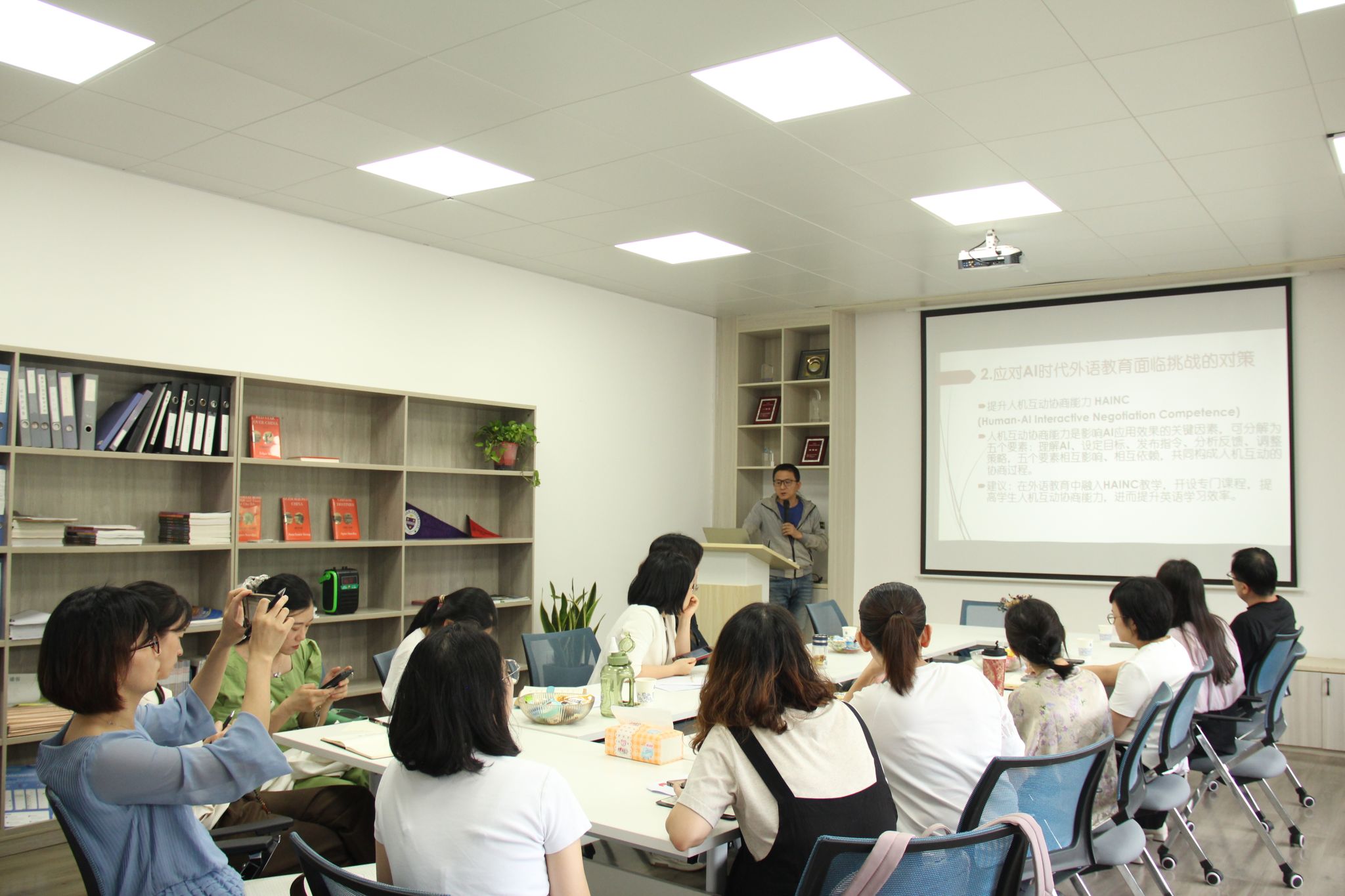 郑摄以“‘语言学研究新视角:理论、实验和方法研修班’研修汇报”为题分享自己暑期参加外研社北京研修班的心得体会,传递前沿的学术理念。他总结了研修活动中各位大咖的发言内容,引用了外语领域研究的创新案例,讲述了自己作为一线教师对于科学研究的思考。他强调,基于数字化转型背景下,技术赋能教育成为必然趋势,我们要深耕外语教育教学,不断拓展语言研究新路径。