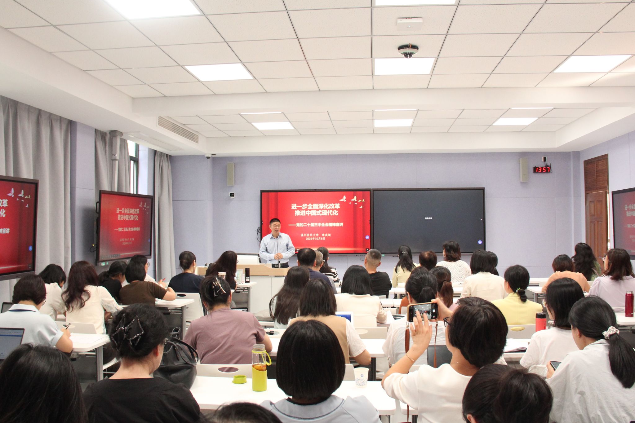 章成斌以《进一步全面深化改革 推进中国式现代化》为题,聚焦党的二十届三中全会审议通过的《中共中央关于进一步全面深化改革、推进中国式现代化的决定》,结合国家时政热点和学校发展实际,紧紧围绕“为什么改”“向哪里改”和“怎么去改”三个核心问题对党的二十届三中全会精神进行全面解读。