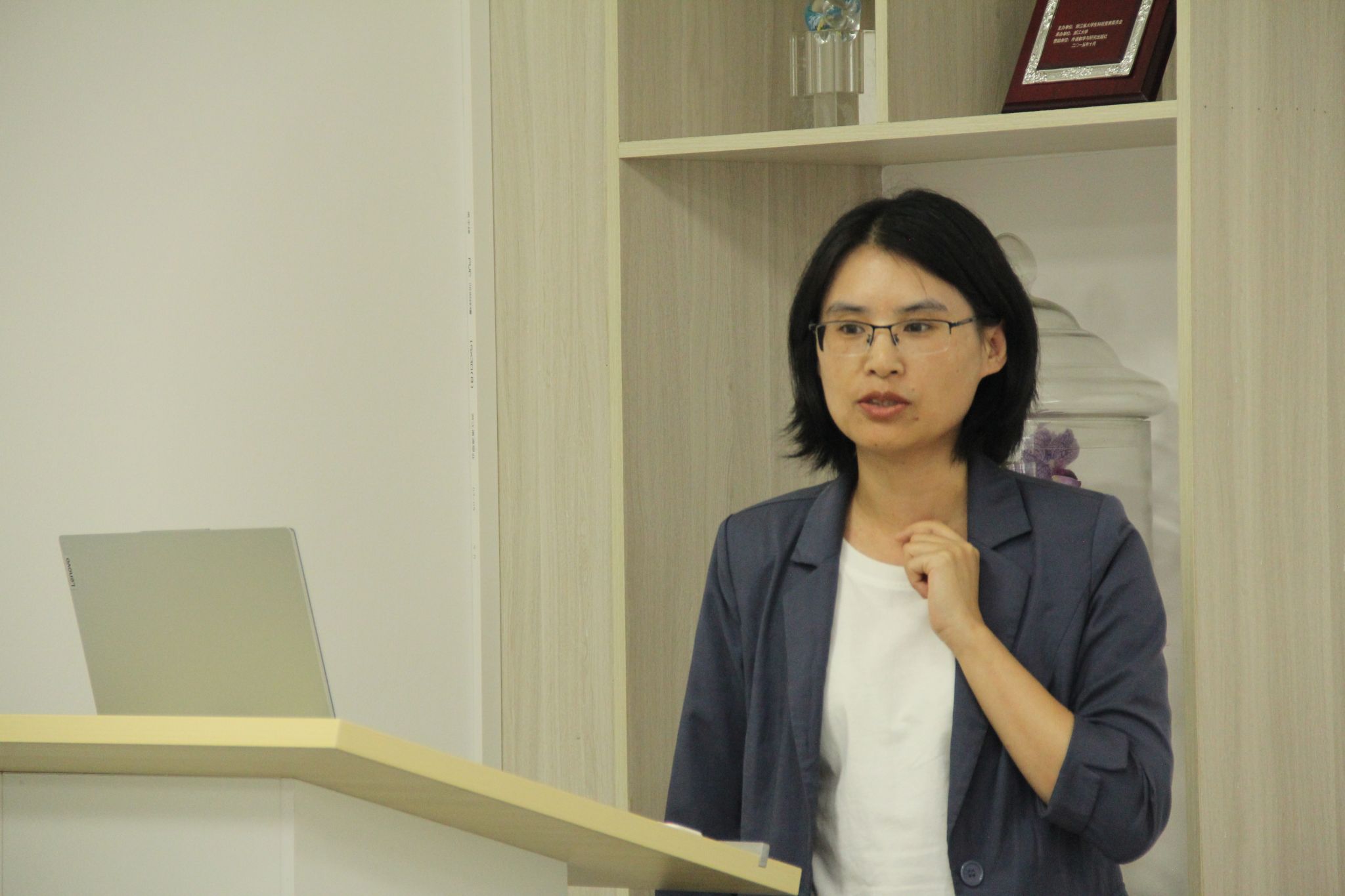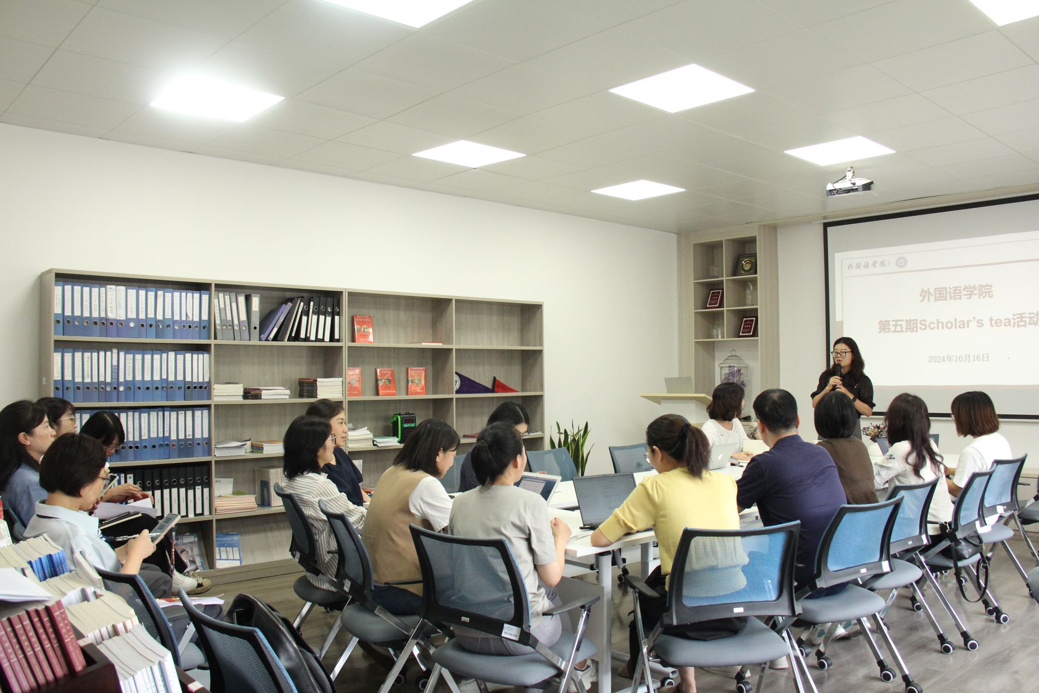 在同仁楼B102教授工作室顺利举办“Scholar’s Tea”第五期活动。此次活动特邀章艳乐副院长以及优秀青年教师伊迎、李嫱和麻新芳作为嘉宾进行学术分享。学院教师20余人参与本次活动,活动由陆晓鸣副教授主持。
