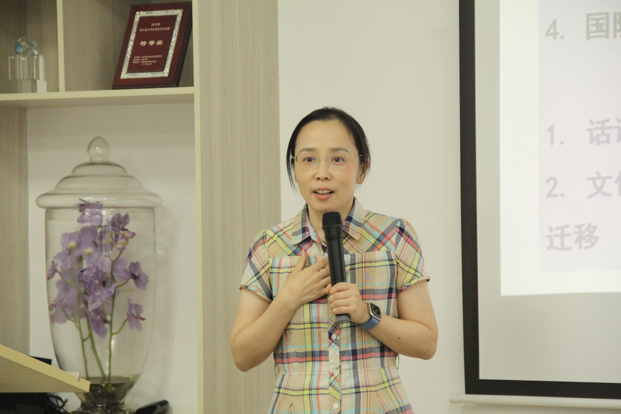 伊迎老师以“文化场域下的话语研究”为题分享暑期参加第五届“文化话语研究”高级研修班的心得体会,传递前沿的学术理念。她指出,人类交际是一个由不同话语体系所组成的多元统一体,任何话语都无法与其文化场域割裂开来。通过人权事业话语、贸易纠纷话语、城市发展话语、国家安全话语等案例分析,研究如何运用文化话语范式看生活中的话语具有非常重要的意义。