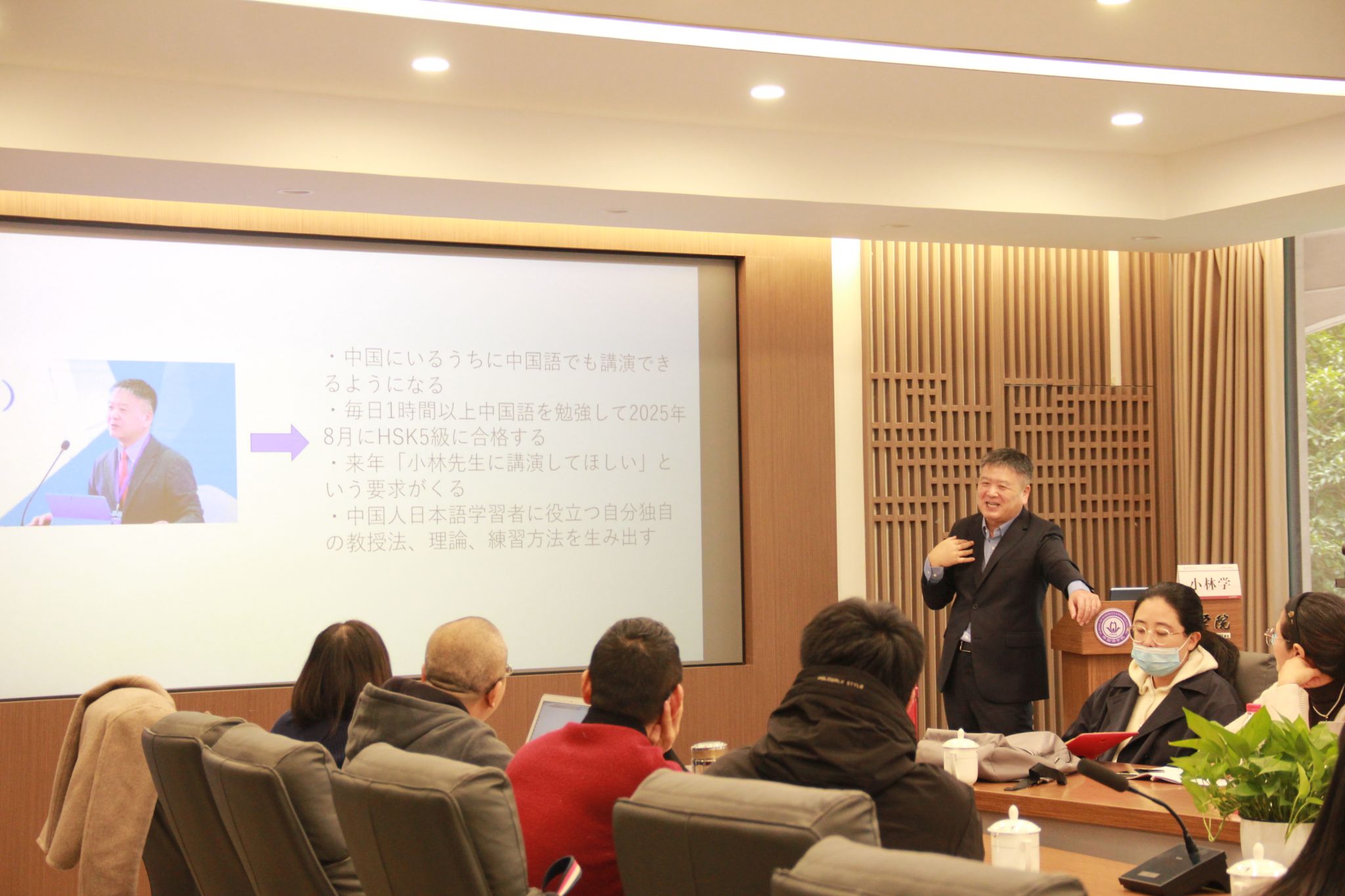 下午,日本国际交流基金的日语教育专家佐久间司郎先生则以“如何提高学生学习动机”为题,奉献了一场精彩绝伦的汇报。他独辟蹊径地以逆向思维为切入点,紧密结合专业实证研究成果,鲜明地提出教师与授课是影响学生学习动机的两大核心要素,并基于此深刻洞察,佐久间先生还无私分享了源于自身丰富实践经验的具体问题解决方案。在他的带动下,日语系教师们围绕教学实践中所面临的种种问题展开了热烈而富有成效的讨论,各抒己见,氛围热烈非凡。