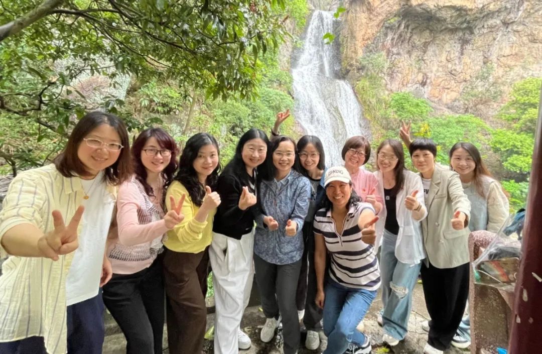 上午的仙岩梅雨潭景区在雨中别具韵味。三姑潭水面泛起层层涟漪,各色雨伞倒映潭中;梅雨潭瀑布在雨幕中若隐若现,凉亭内艾草香囊的清香与湿润空气交织;攀登雷响瀑时,脚步声落在湿滑的石阶上与瀑布轰鸣遥相呼应。梅雨亭前,教师们排成心形,将飞泻的瀑布框进镜头,大家轮流以瀑布为背景,或端庄肃立,或展臂欢呼,快门声此起彼伏。