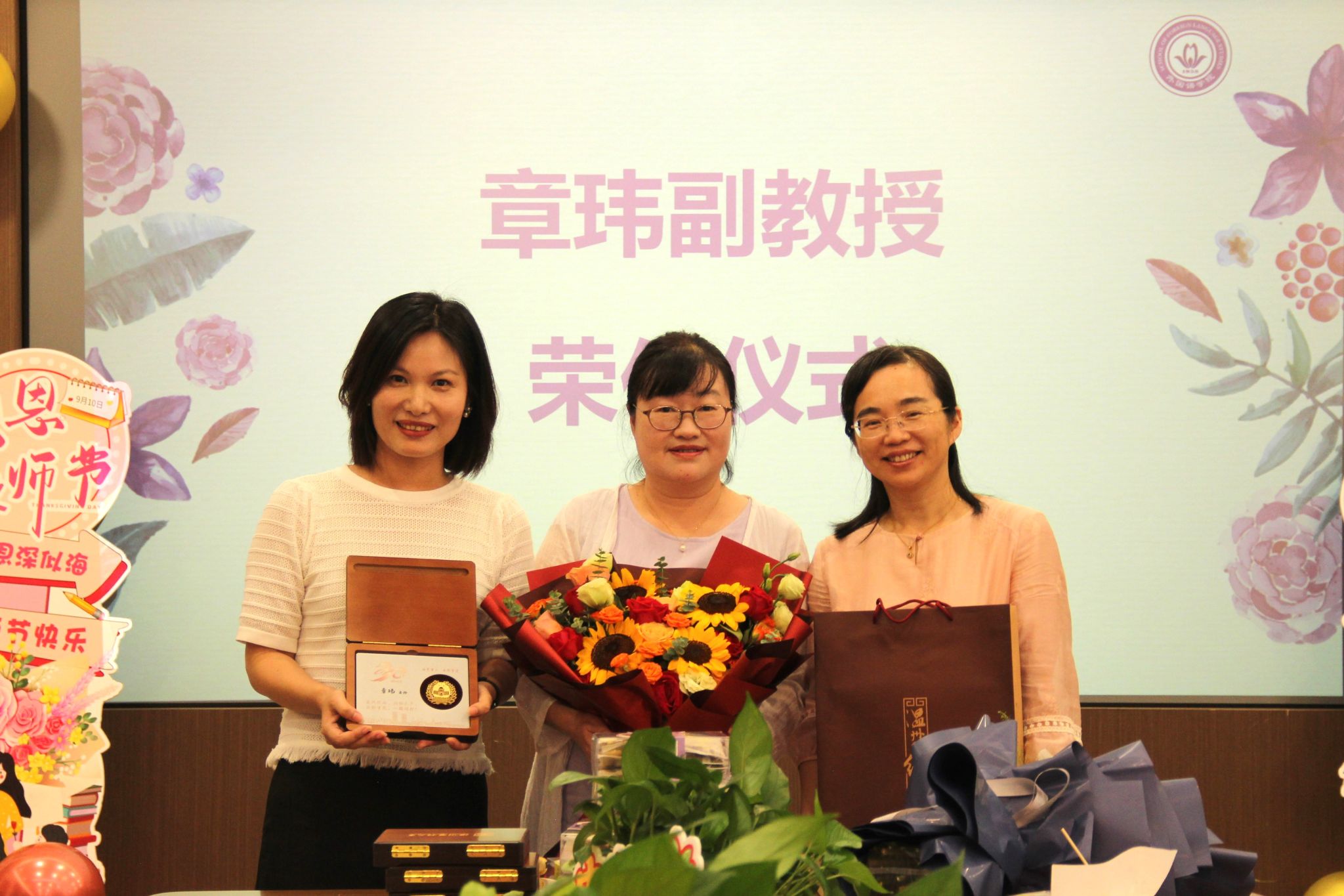 的教学生涯,表达了对学院大家庭的深厚感情和对同事们的感激之情。副院长章艳乐代表学院向章玮老师致以崇高的敬意和美好的祝福,希望她在退休后的生活中继续关心和支持学院的发展。刘洁书记和章艳乐副院长为章玮老师送上鲜花和礼物,并合影留念。