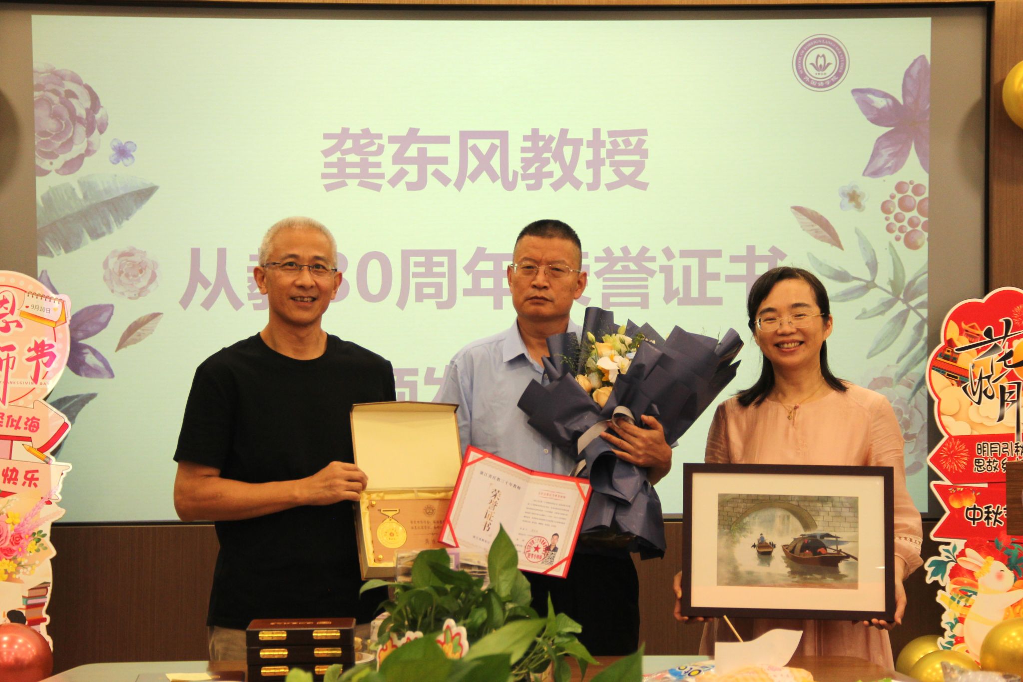 龚东风教授则以自身三十年教学生涯为例,深情分享了他对于“教育家精神”的理解与感悟。他认为,“教育家精神”不仅是新时代人民教师的崇高使命,更是每一位教育工作者追求的精神高地。他鼓励大家要秉持工匠精神,持续探索学科前沿,对教育充满热情,对学生心怀大爱。活动现场,刘洁书记与学院处级组织员陈明龙共同为龚东风教授送上了三十周年教龄纪念章和鲜花,并合影留念。