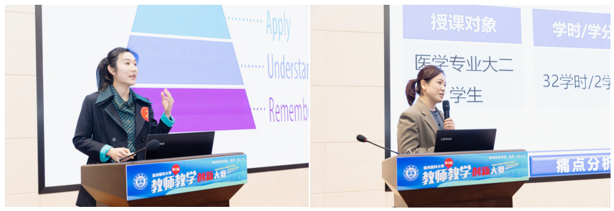 教师陈亦挺以《<通用医学英语>教学设计创新汇报》为题,深入分析了《通用医学英语》课程的特点和痛点,展现了多维度的创新途径,分享了包括人才培养、教师成长、课程建设等方面的创新成效。赵蓓蓓的《基于产出导向法的PEACE在<大学英语(2)>中的实践》,从课程特色、痛点分析、创新特点和成效应用四部分对《大学英语(2)》进行全面讲解,介绍了“PEACE”教学理念的特点,全面说明课程设计思路,展示了教学创新成果。两位老师在本次教学比赛中的优秀表现得到了现场评审的一致好评。最终,陈亦挺获得了一等奖,赵蓓蓓获得了二等奖。
